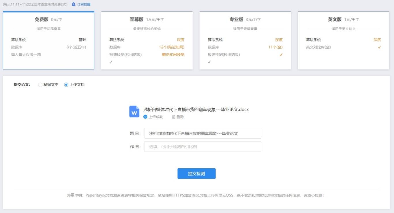 查重说明:「专业版」每天免费2次;「旗舰版」早8点-10点间免费查重1次。